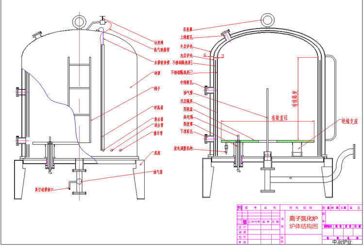 真空氣體氮化爐是由鋼板做成筒狀外殼,里面是由定形的標準耐火磚砌成的加熱工作室,在加熱室和外殼之間填滿了保溫材料。加熱室中有一不銹鋼焊接的密封爐罐,爐罐上部裝真空橡膠密封圈,下部為水冷套,爐蓋頂部裝有均熱風機,保證了爐內氣氛的均勻。