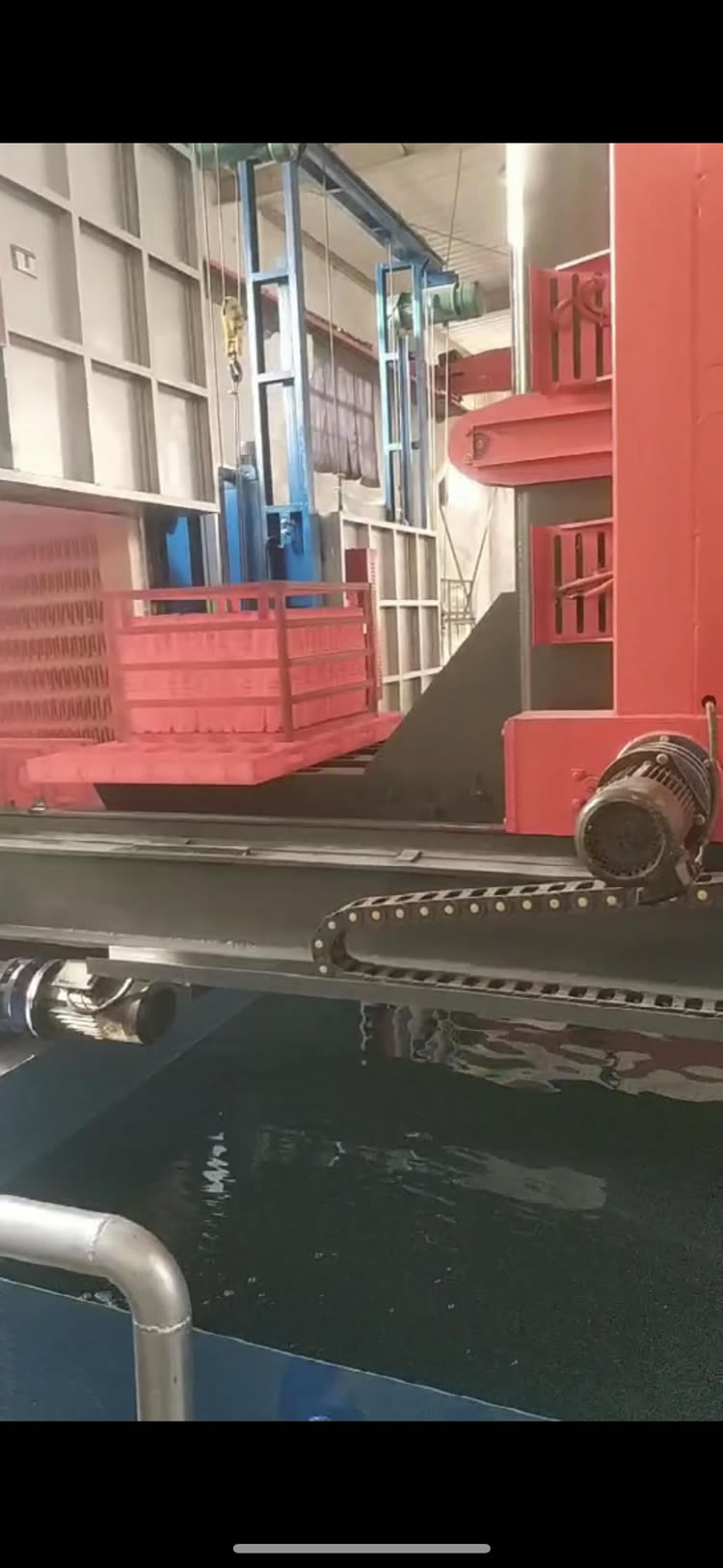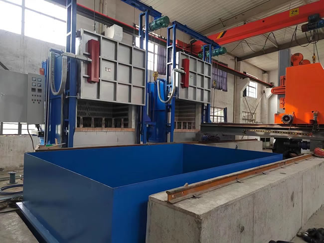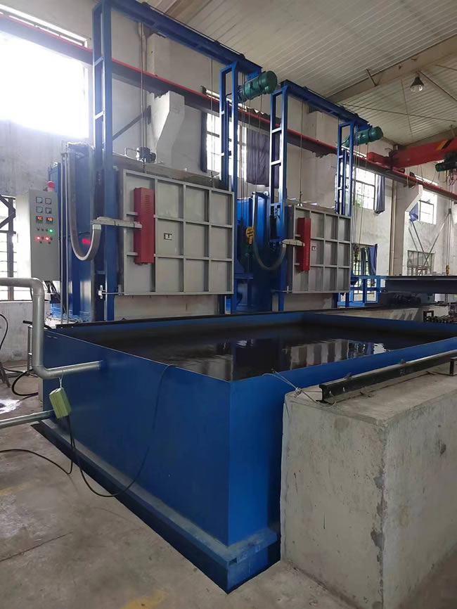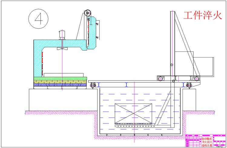 3、出爐淬火:按動出爐按鈕——中轉(zhuǎn)車移動到淬火爐爐口——爐門開啟——中轉(zhuǎn)車把工件移出爐膛——中轉(zhuǎn)車后退——升降叉下降,工件進入淬火介質(zhì)——中轉(zhuǎn)車帶動工件在水中左右擺動(次數(shù)可調(diào))——中轉(zhuǎn)車上升瀝水——淬火工作完成