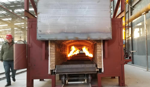 隧道爐由爐體、爐門、臺(tái)車、臺(tái)車轉(zhuǎn)移平臺(tái)、液壓推料機(jī)構(gòu)、燃燒系統(tǒng)、排煙系統(tǒng)、測(cè)溫系統(tǒng)等組成。隧道窯整個(gè)爐膛分為預(yù)熱段、加熱段及均溫段三段。