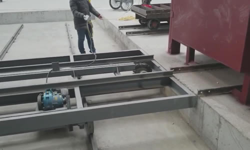 臺(tái)車轉(zhuǎn)移小車:爐體兩端的橫向軌道上(與入爐軌道及返回軌道垂直)分別布置一臺(tái)臺(tái)車轉(zhuǎn)移小車,電動(dòng)自行,可方便完成由爐內(nèi)到返回軌道上的臺(tái)車轉(zhuǎn)移。進(jìn)料端轉(zhuǎn)移小車負(fù)責(zé)把返回軌道上的臺(tái)車轉(zhuǎn)移到爐前臺(tái)車推進(jìn)器前,完成入爐;出料端轉(zhuǎn)移小車負(fù)責(zé)把爐內(nèi)推出的的臺(tái)車送到返回軌道上。