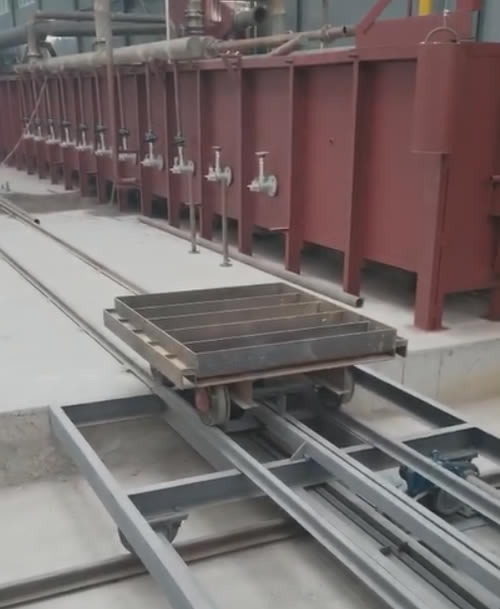 窯車:車架采用鋼結(jié)構(gòu);在臺(tái)車車架上砌有耐火材料的保溫層,臺(tái)車面上為重質(zhì)耐火粘土磚砌筑并保證臺(tái)車面的平整,上面鋪上細(xì)砂,模殼可在窯車上澆注。臺(tái)車與爐體的密封采用迷宮密封結(jié)構(gòu)。軌道選用輕軌;窯車驅(qū)動(dòng)采用液壓缸推動(dòng)。